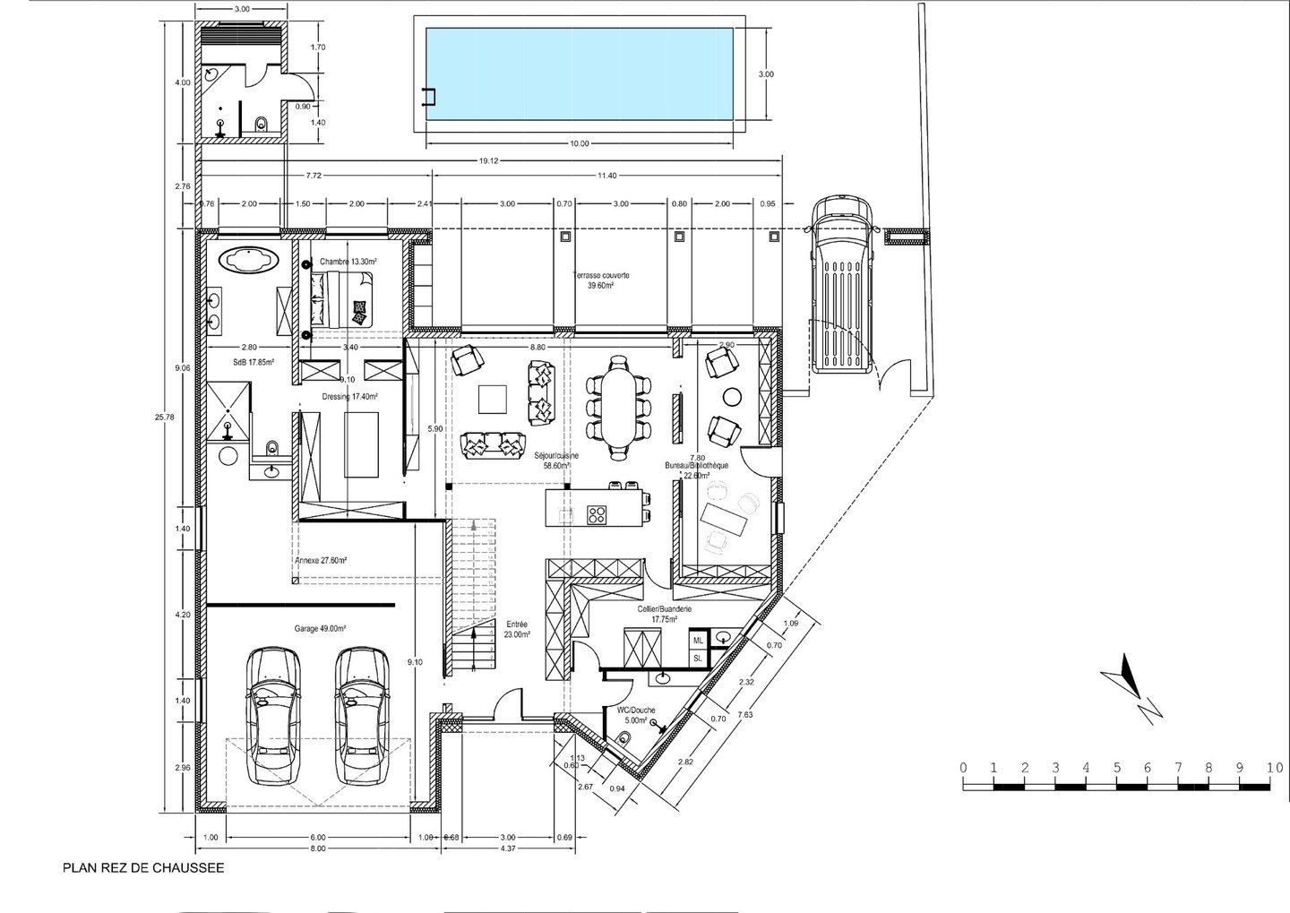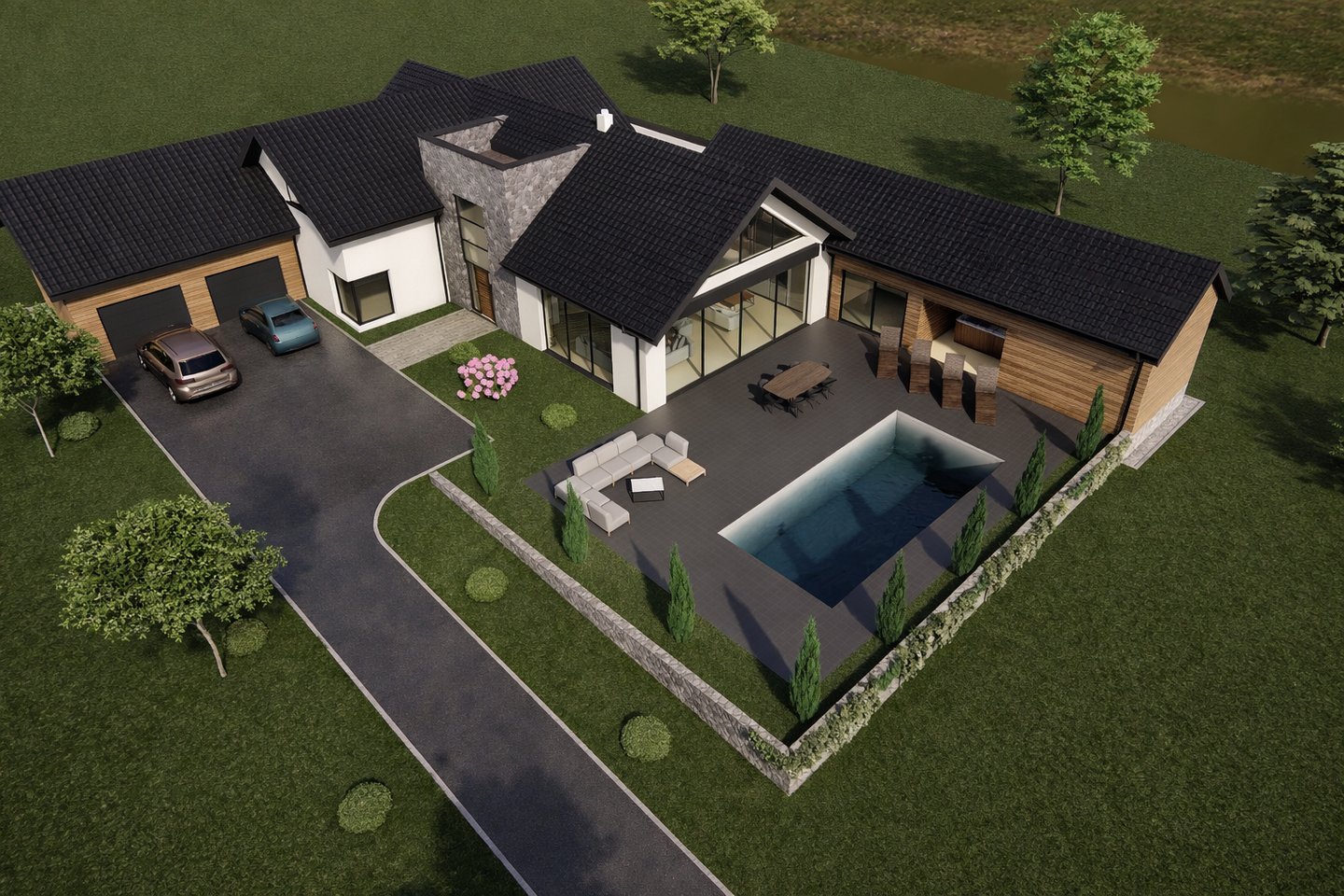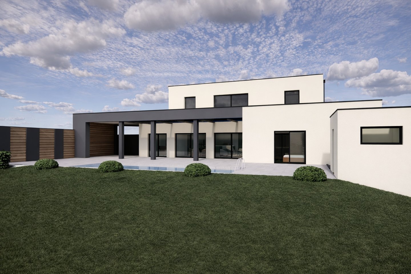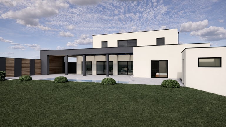 Le projet consiste en une villa contemporaine comprenant une cuisine ouverte sur séjour, une suite parentale et 3 chambres à l'étage. Une piscine extérieure complète l’ensemble immobilier.