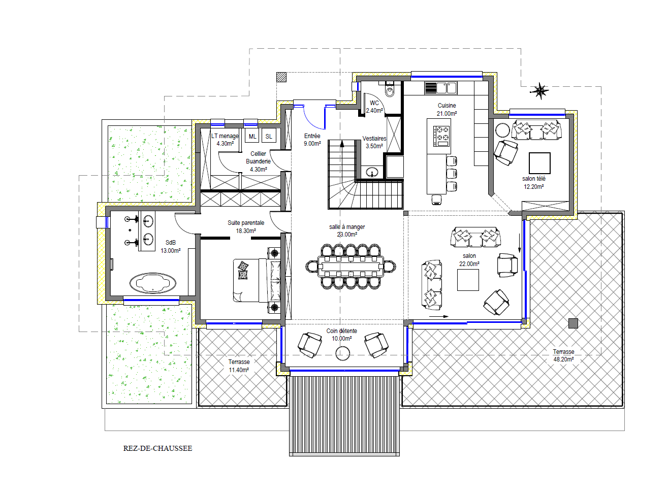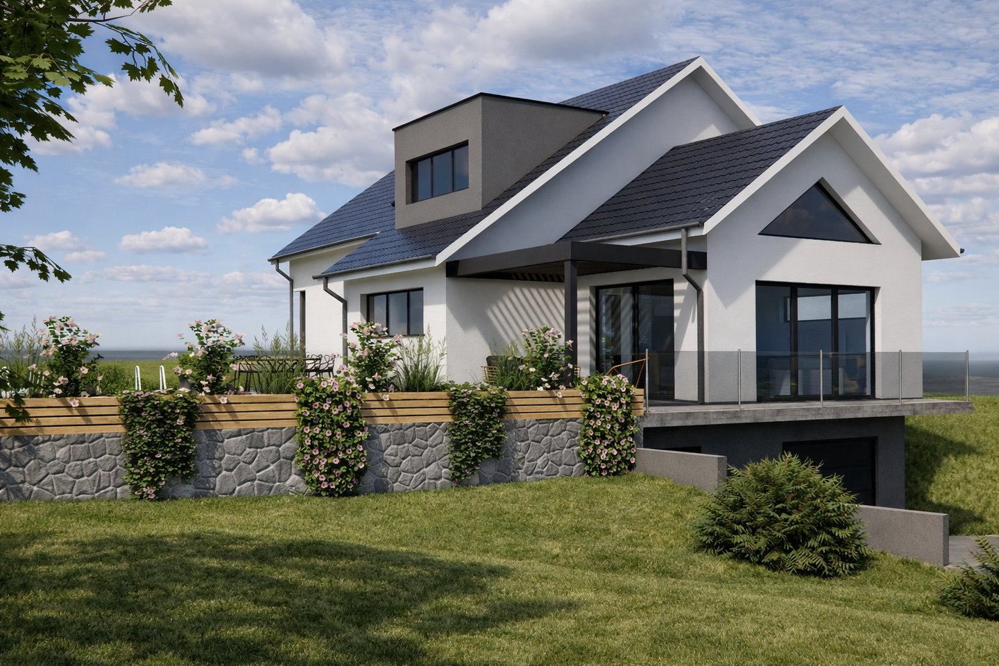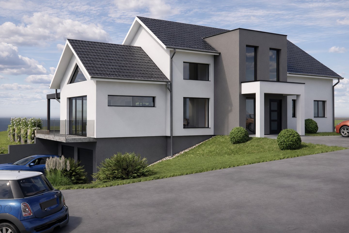 La maison épouse le terrain avec une entrée côté route donnant sur le rez-de-chaussée qui comprend : cuisine ouverte sur salon et salle à manger, une suite parentale et une chambre secondaire