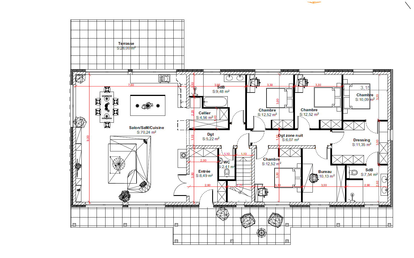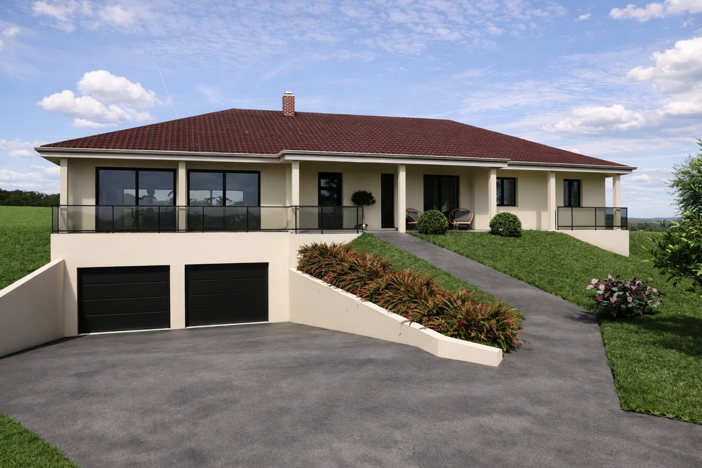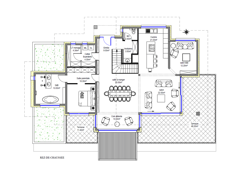 Construction d’une maison d’habitation en longueur sur une grande surface de cave et de garage. Le rez-de-chaussée intègre la partie habitable de 188.00 m². L'accent est porté sur l'exposition au soleil et la luminosité des pièces. Le prolongement de la toiture sur les terrasses apporte un côté esthétique au projet.